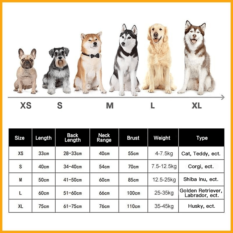 Available in 5 sizes from XS to XL, it fits small, medium and large dogs and cats. The round chest and neck are adjustable to better cover the animal's body.